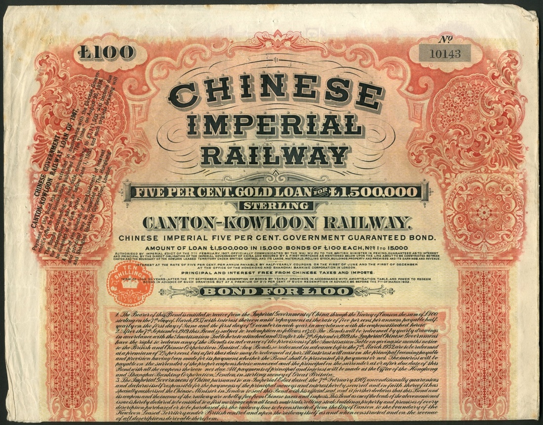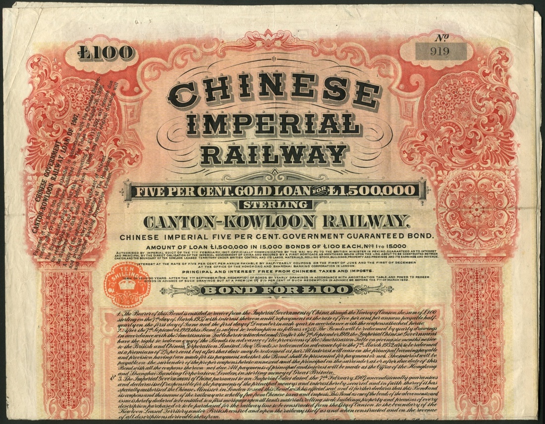 (x) China: Canton Kowloon Railway 5% Gold Loan 1907, a pair of £100 bonds # 919 and #10143, large format, red and black, with coupons, printed by Waterlow & Sons. AVF (2).