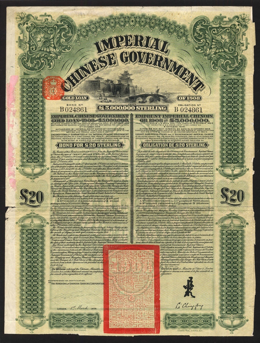 China: 1908 5% Gold Loan, Bond for £20 issued by the Hongkong and Shanghai Banking Corporation, walled city at top, green and black, red chop bottom centre, printed by Waterlow, no coupons remain as is usual. A few tiny edge nicks and some paper adhesion at left edge, F-VF and very scarce issue of which only 250 issued.