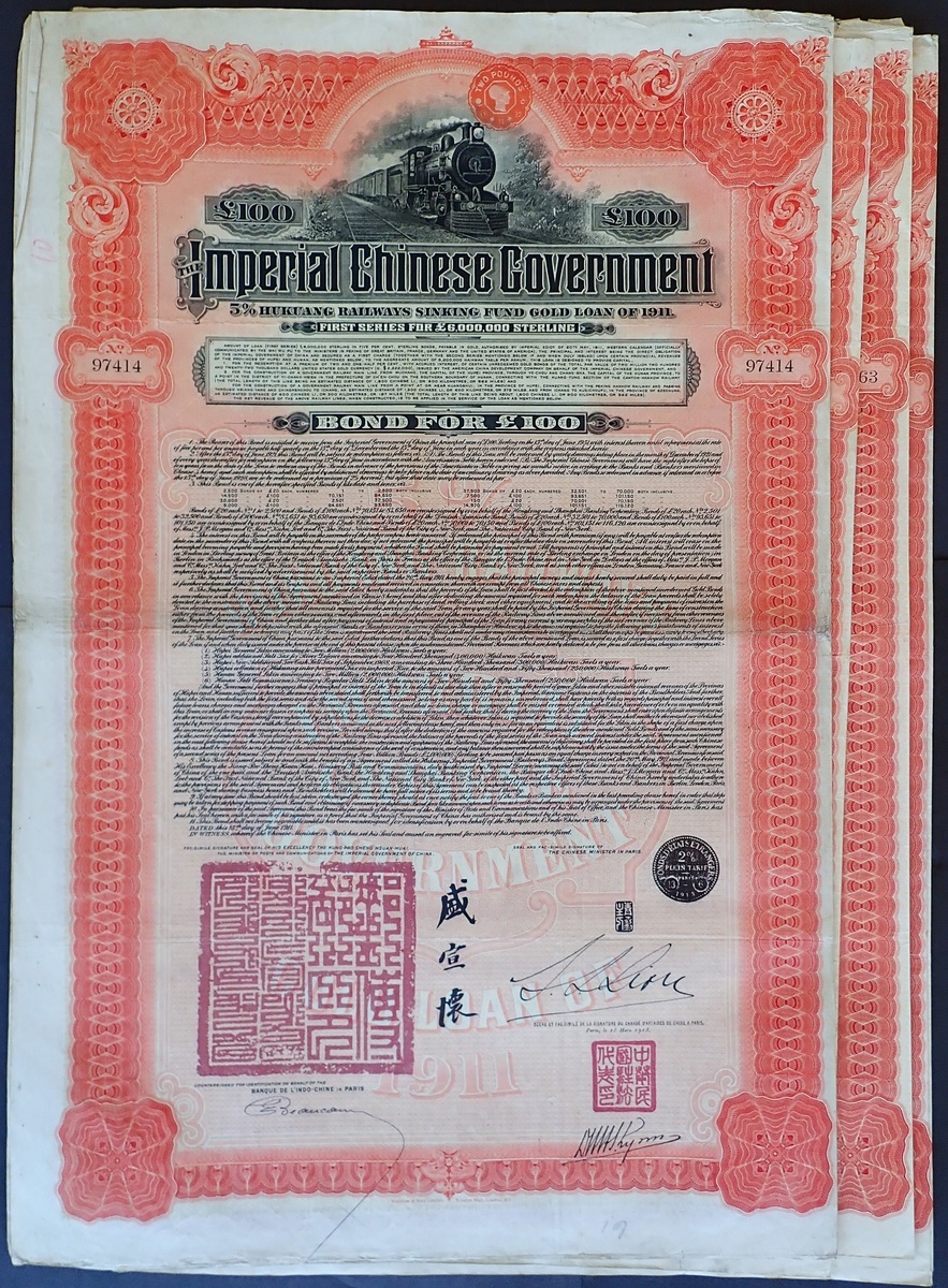 China: 1911 5% Hukuang Railways Gold Loan, a group of 9 bonds for £100, issued by Banque de L'Indo-Chine, large format, steam train at top, red, printed by Waterlow & Sons, with coupons. Folds but no damage F-VF (9).