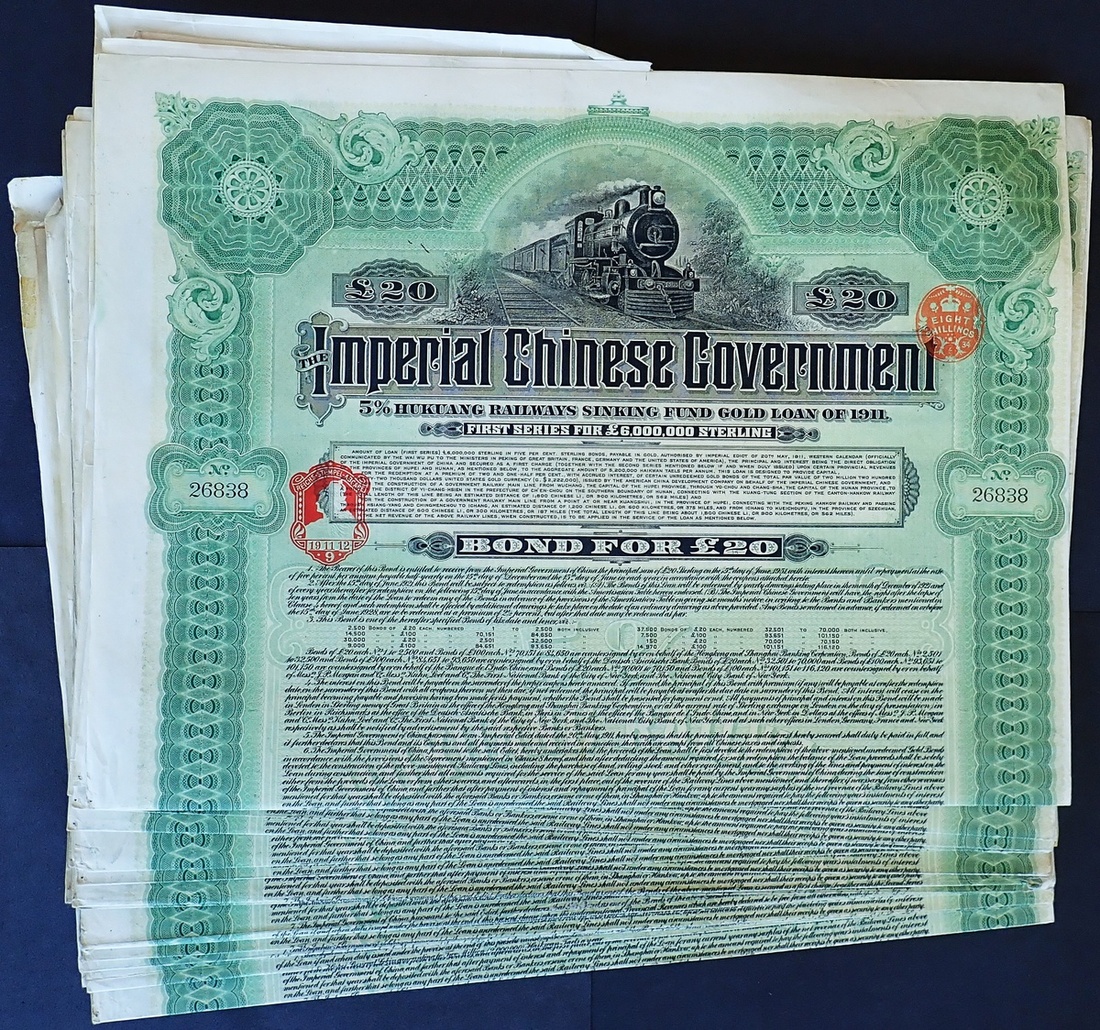 (x) China: 1911 Hukuang Railways 5% Gold Loan, a group of 20 bonds for £20 issued by the Deutsch-Asiatische Bank, large format, green and black, with coupons. A nice condition group mostly VF and better (20).