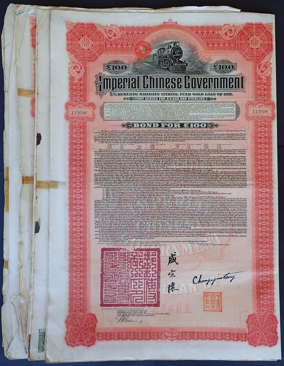 China: 1911 5% Hukuang Railways Gold Loan, a group of 13 bonds for £100, issued by the American Banks consortium headed by J.P.Morgan, large format, steam train at top, red, printed by Waterlow & Sons, with coupons. Some with small taped edge repairs otherwise F-VF (13).