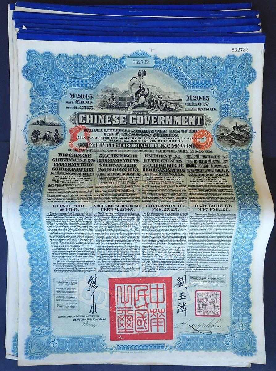 (x) China: 1913 5% Reorganisation Gold Loan, a group of 10 bonds for 2045 marks, issued by the Deutsch-Asiatische Bank, blue, printed by Waterlow, with coupons. Generally VF-EF (10).