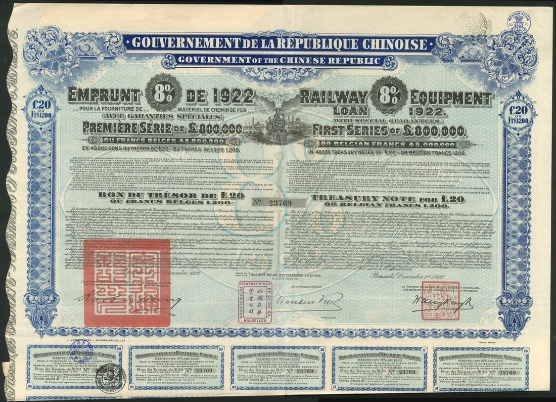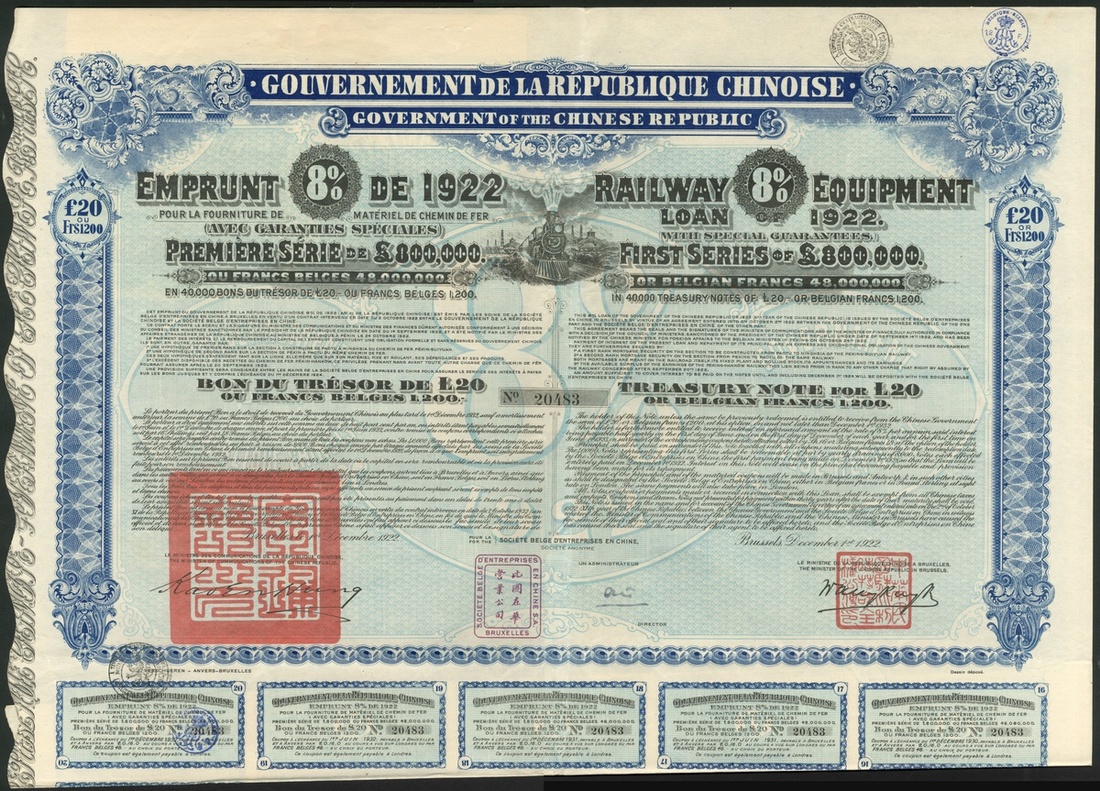 China: 1922 8% Railway Equipment Loan, a pair of bonds for £20 or 1200 Belgian francs, #20483 and #23769, large format, small steam train in centre, blue and black, text in English and French, with coupons. GVF (2).