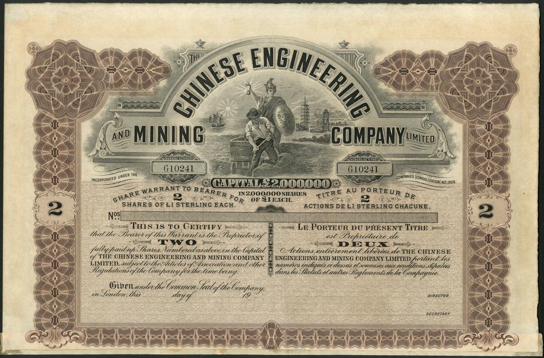 China: Chinese Engineering and Mining Co. Ltd., an unissued certificate for 2 shares of £1, 19- (circa 1925), #G10241, Britannia and miner with pagoda and junk in background, brown, printed by Waterlow & Sons, with replacement coupons. Light mount marks on reverse otherwsie EF and scarce.