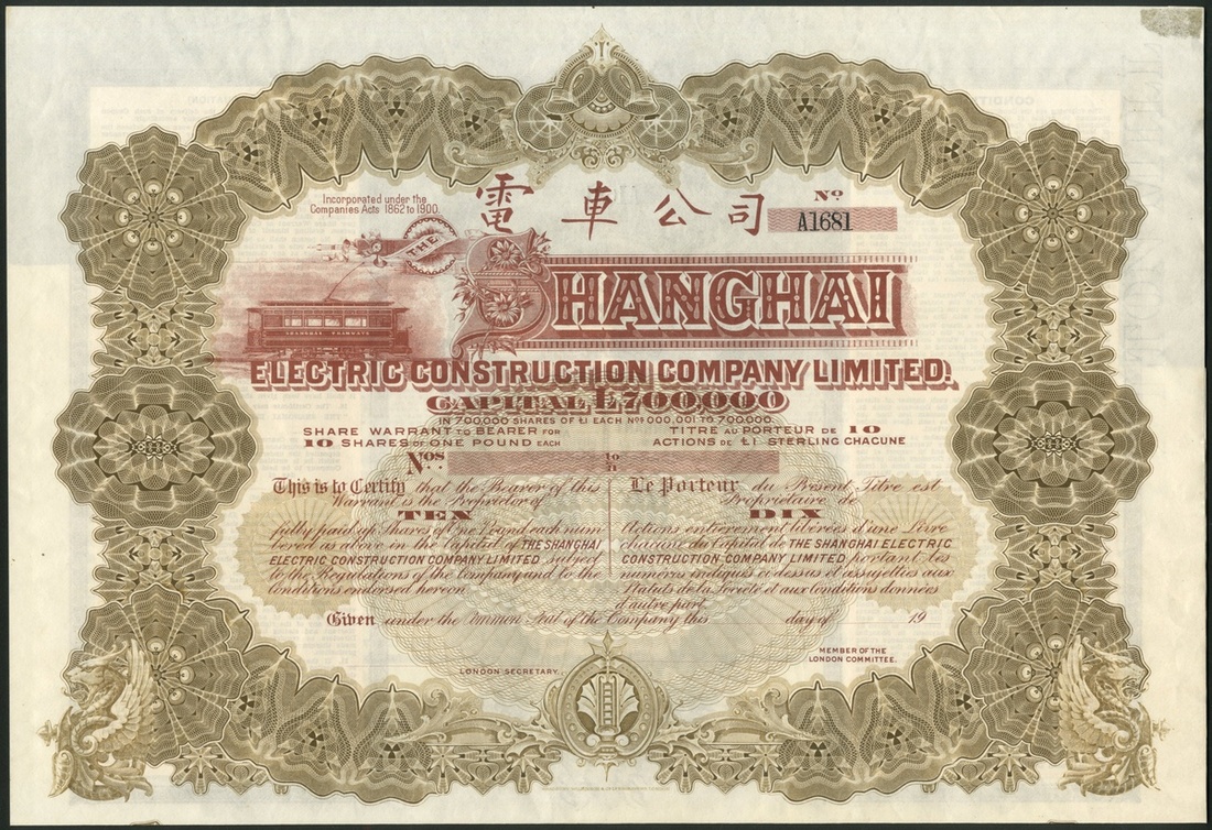 China: Shanghai Electric Construction Company Limited, unissued certificate for 10 shares of £1, 19- (circa 1920), n#A1681, capital £700,000, vignette of tram, red and brown, with coupons. Light mount mark top right corner but EF.