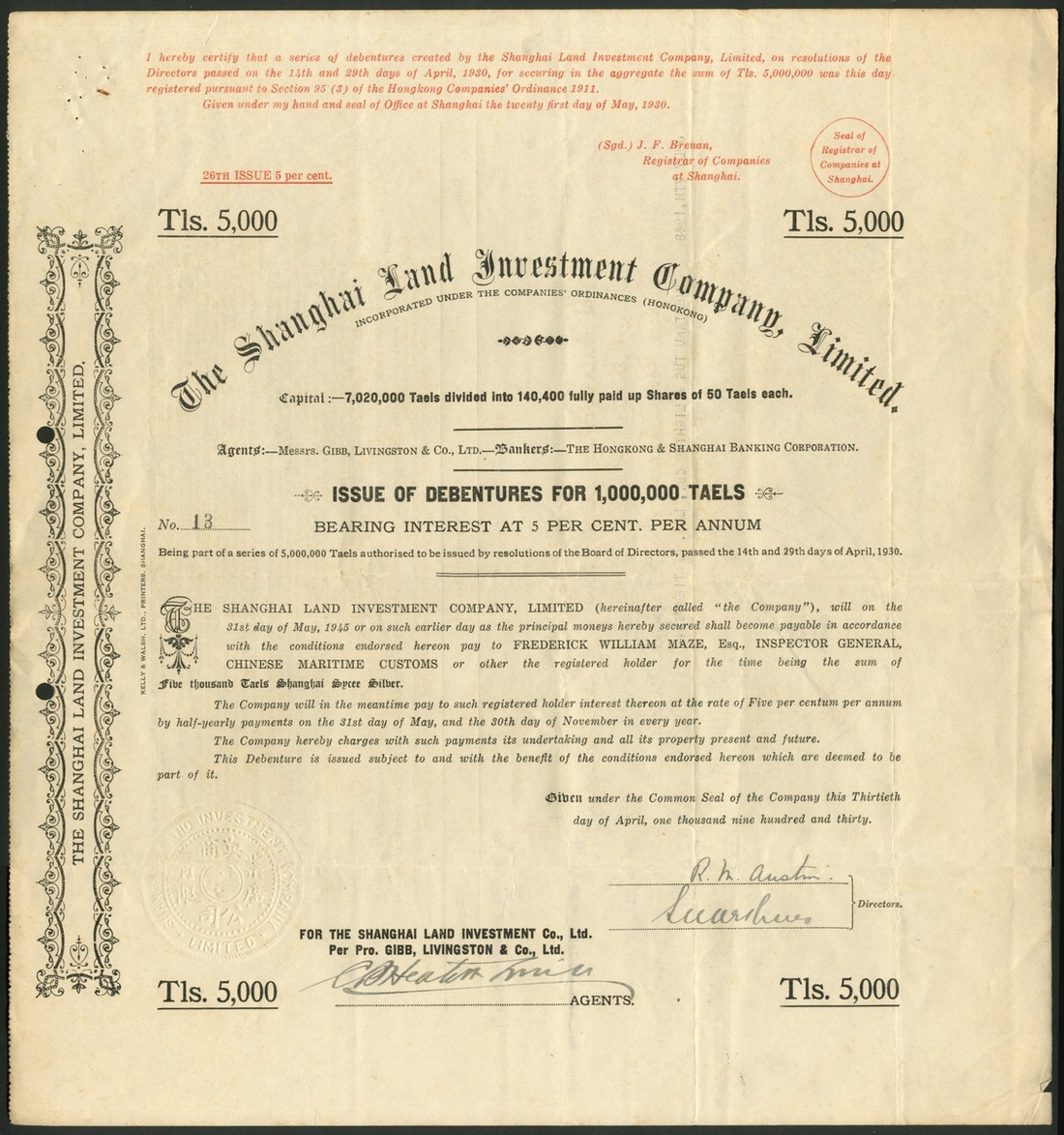 China: Shanghai Land Investment Co. Ltd., 5% debenture for 5000 taels, 1930, 26th issue, #13, large format piece printed in black and red, embossed seal. Only 200 issued of this series. VF and rare.