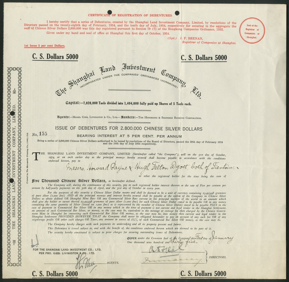 China: Shanghai Land Investment Co. Ltd., 5% debenture for 5000 Chinese dollars, 19[35], 1st issue, #155, large format piece printed in black and red, grey paper, embossed seal. Approximately 400 issued of this series and denomination. VF and rare.