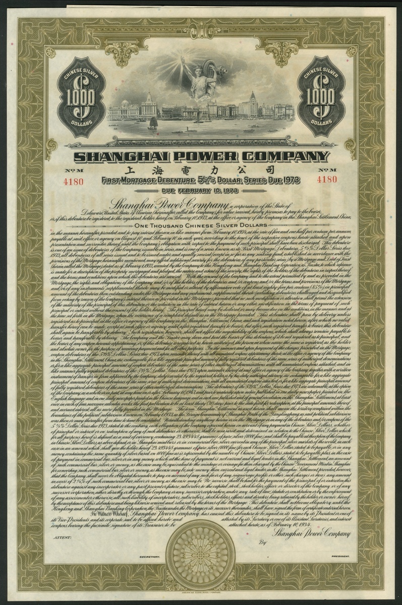 (x) China: Shanghai Power Company, First Mortgage 5½% Debentures, 1934, unissued $1000 bond, #4180, olive green and black, with coupons from #30, WITHOUT 1937 red endorsement over vignette. EF.