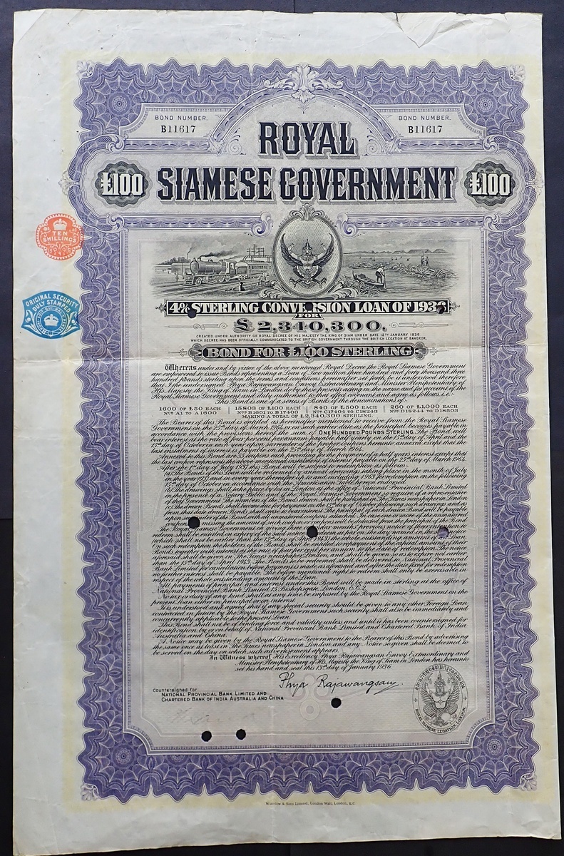 Thailand: Royal Siamese Government, 4% Sterling Conversion Loan of 1936, bond for £100, #B11617, large format piece with coat of arms flanked by speeding steam train and rice field, mauve and black, printed by Waterlow & Sons, with coupons, a few cancellation holes. Tear at top edge otherwise VF.