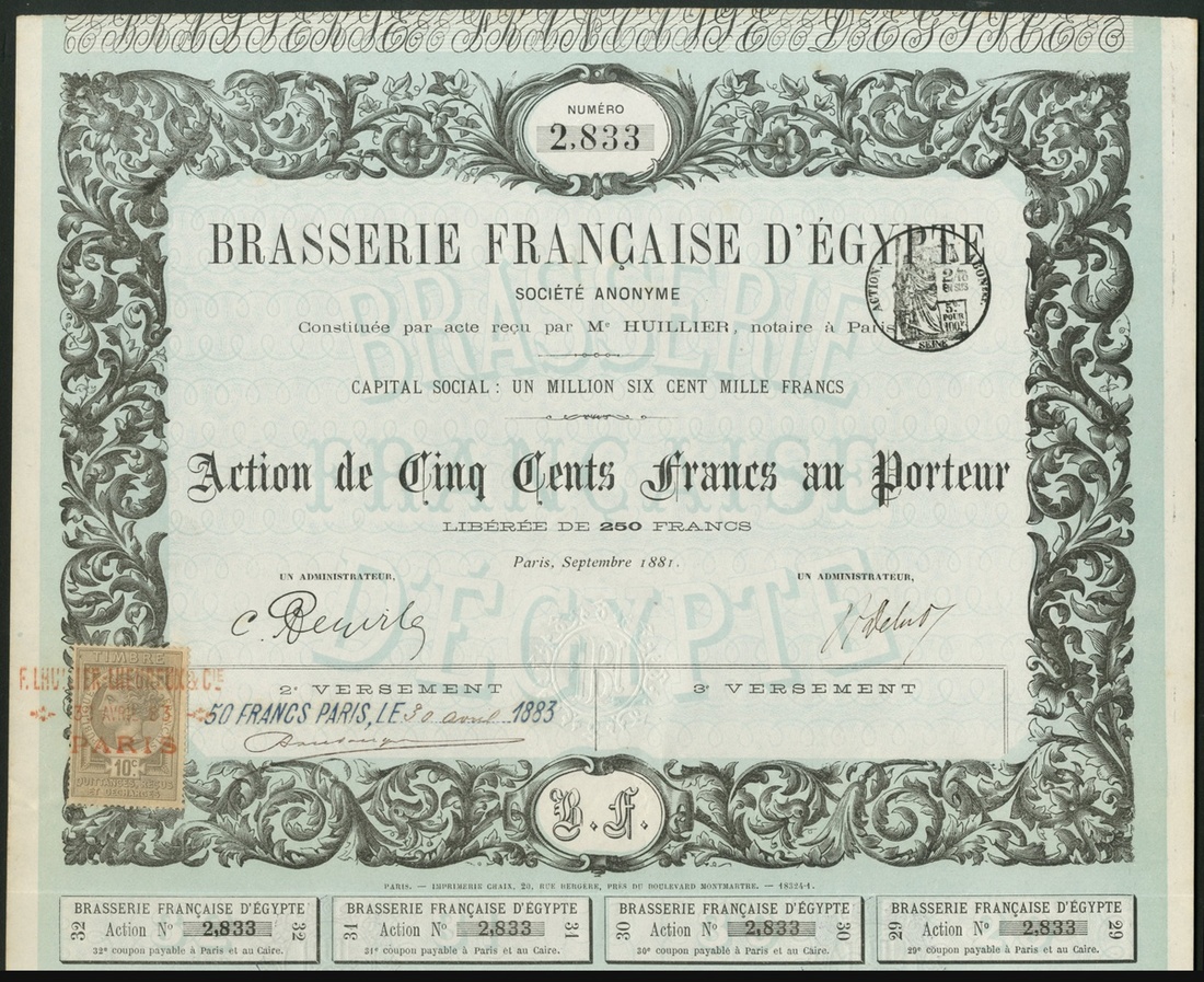 Egypt: Brasserie Francaise d'Egypte S.A., 500 franc share, Paris 1881, #2833 of 3200 issued, ornate border, black, blue underprint, with coupons. Formed in 1873 by Baron Delort de Gléon (1843-1899) who was also a director of the Alexandria Water Company and founder of the Cairo Water Company. Also a director the Land Bank of Egypt. EF and scarce.