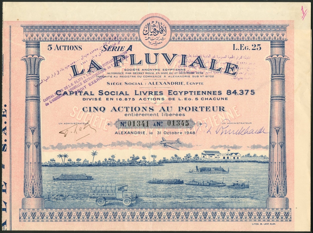 Egypte: La Fluviale S.A., certificate for 5 shares of E£5, Alexandria 1948, #1341-1345, very pretty piece with cargo ships and barges on river, loaded truck alongside, aircraft above, blue and pink, with coupons. GVF.