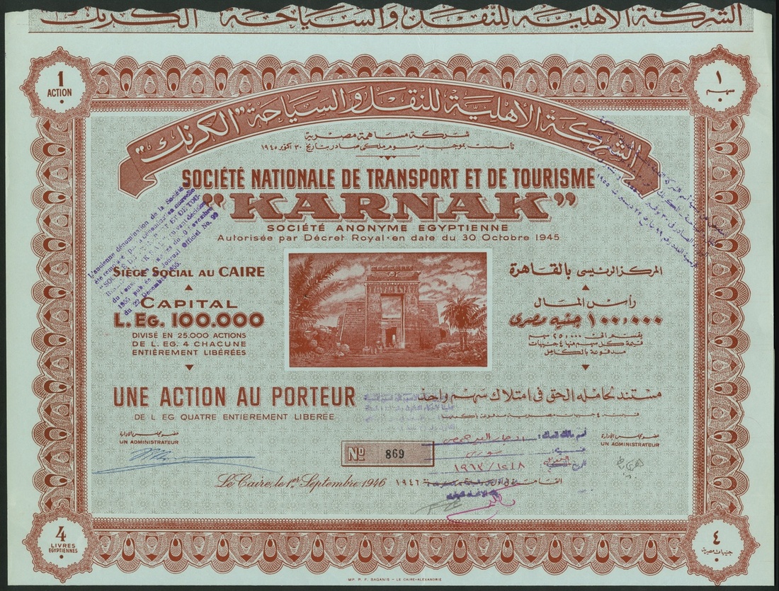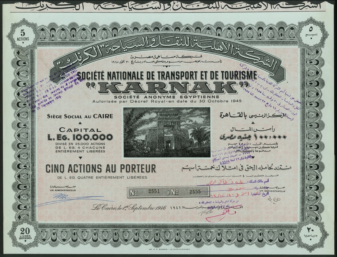 Egypt: Société Nationale de Transport et de Tourisme "Karnak", a pair of certificates for 1 share, #869 and 5 shares, #2551-2555, of E£4 each, Cairo 1946, vignette of entrance to Karnak Temple in centre, ornate borders, red with grey underprint and black with pink underprint respectively, both on blue paper, with coupons. Both about EF (2).