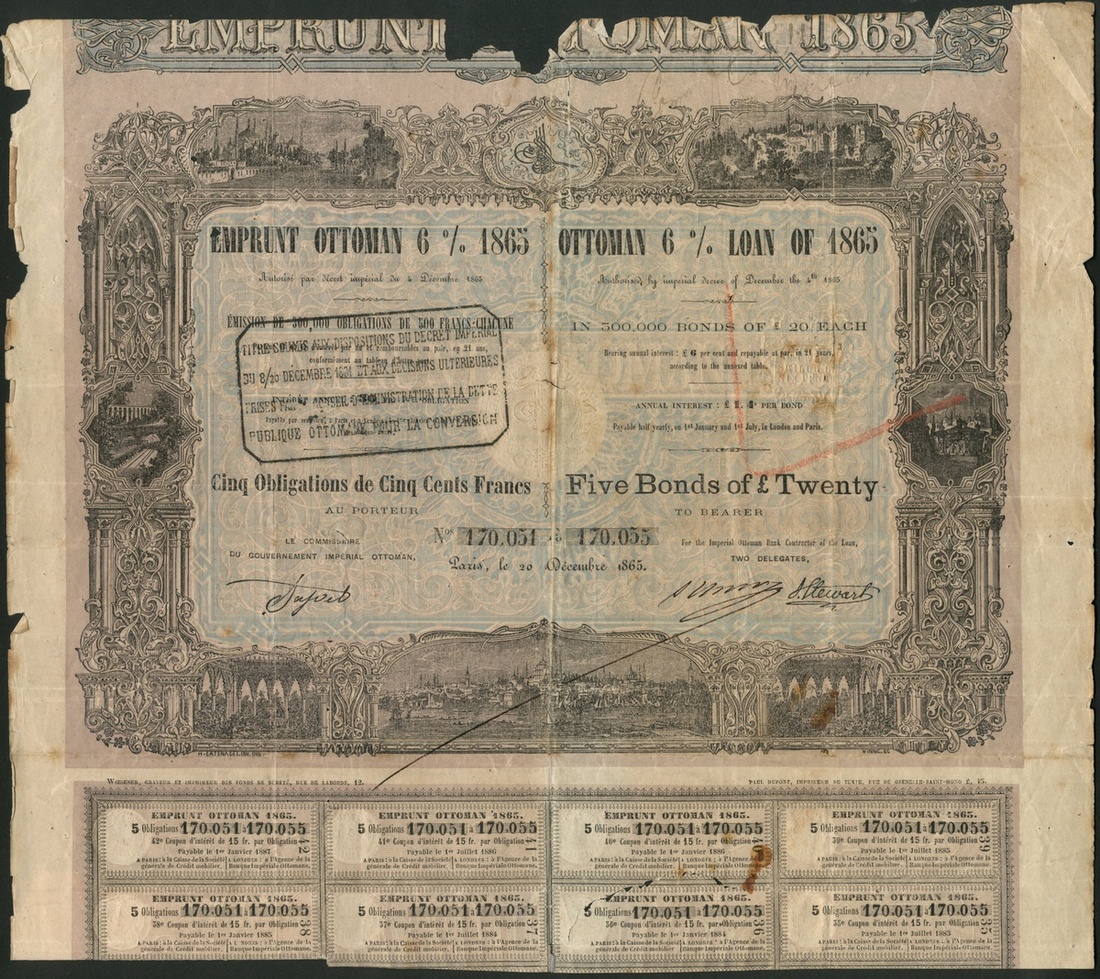 Ottoman Empire: 1865 6% Loan, certificate for 5 bonds of £20, Paris 1865, #170,054-170,055, attractive border of city views, black and pink, blue underprint, with coupons. Tears at top edge with small pieces missing but still quite presentable, the worst of the 4 found in this property.