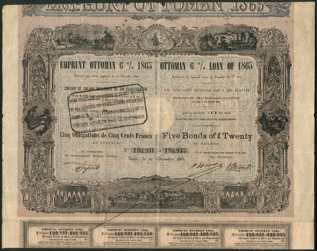 Ottoman Empire: 1865 6% Loan, certificate for 5 bonds of £20, Paris 1865, #198,931-198,935, attractive border of city views, black and pink, blue underprint, with coupons. Small tear at left, F-VF and rare.