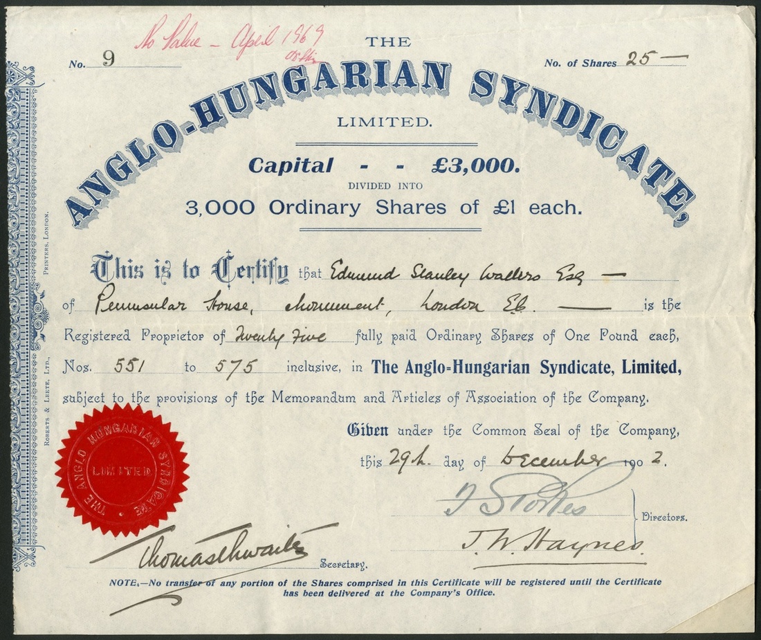Ottoman Empire: Anglo-Hungarian Syndicate Limited, £1 shares, 190[2], #9, blue, red seal. Formed to acquire a concession for a railway extending the Konieh system across Mesopotamia to the Persian Gulf. This was in direct competition to the German Government backed scheme for the Baghdad Railway. VF and rare.