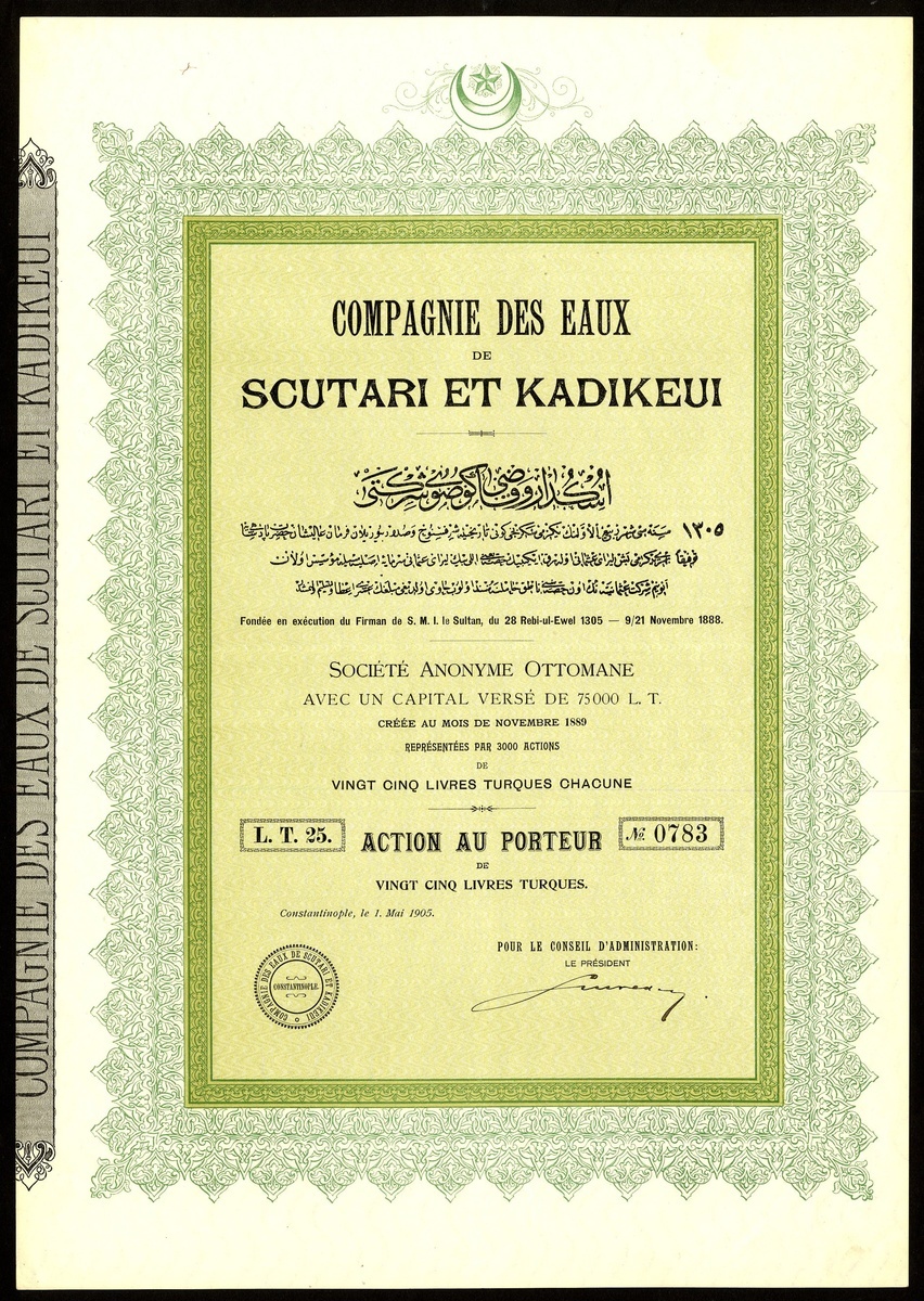 Ottoman Empire: Compagnie des Eaux de Scutari et Kadikeui,T£25 share, Constantinople 1905, #0783, of only 3000 issued, large format green and black, with coupons. Centre fold otherwise EF.