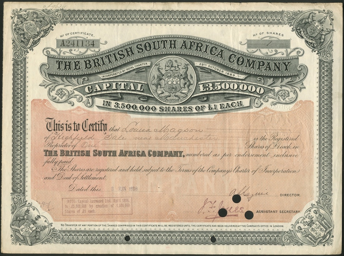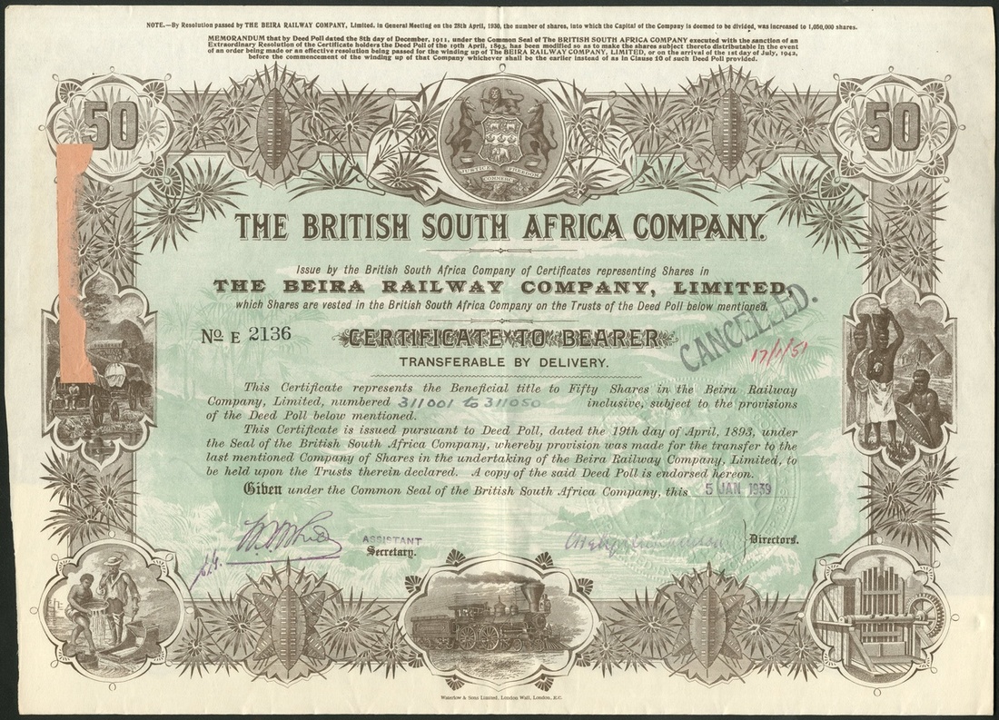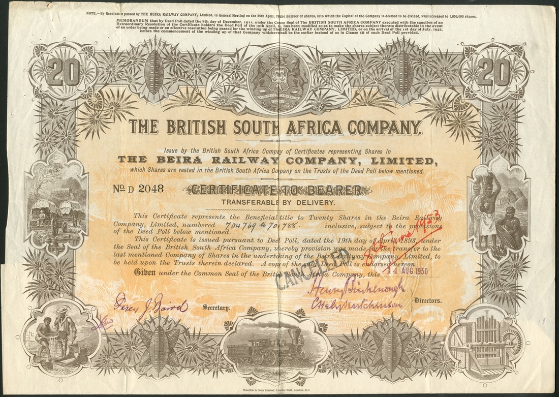 Rhodesia: British South Africa Company, £1 shares, [1898] and [1899], 2 examples, one signed by Earl Grey, black with pink underprint, arms in centre, hole cancelled; together with Antenior (Matabele) Gold Mines Ltd., £1 shares, 189[9], 6 examples, and, issues by the British South Africa Company on behalf of the Beira Railway Company, [1895], through [1939], 11 examples, one which is signed by Alfred Beit, two by Lord Abercorn and two by Lord Grey. Mixed condition F-VF (20),