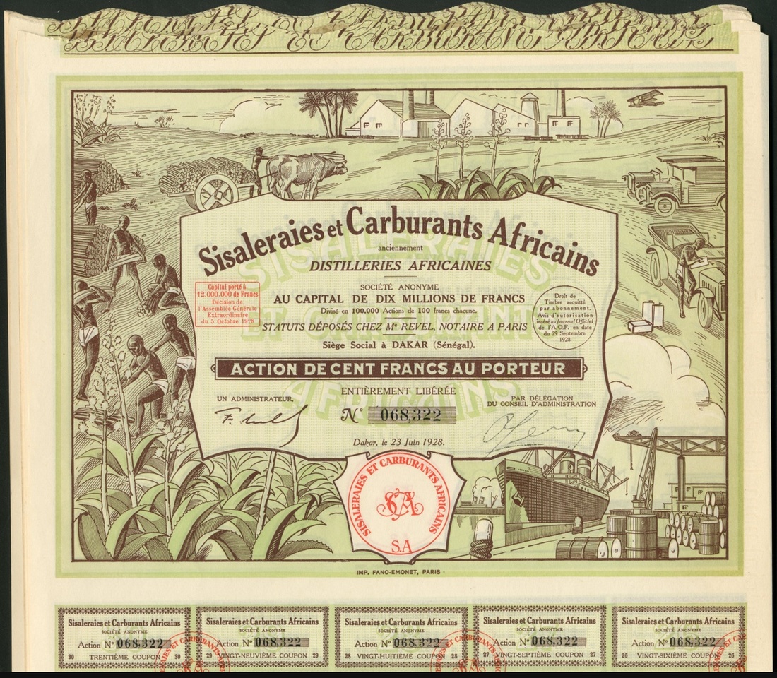 Senegal: Sisaleraies et Carburants Africains anciennement Distilleries Africaines, a group of 28 certificates for 100 franc shares, Dakar 1928, attractive vignette of natives harvesting the sisal crop and a factory producing fuel, green and brown, with coupons. EF (28).