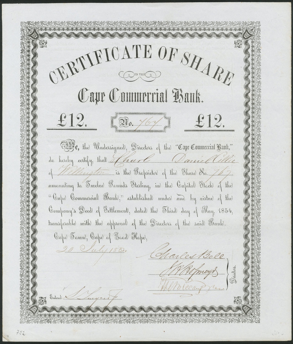 South Africa: Cape Commercial Bank, £12 share, Cape Town [1854], #767, ornate border, attractive black print. Formed in 1854. Expanded into the Transvaal in 1873 during the first mining boom but failed and closed in 1882. Near EF and scarce.