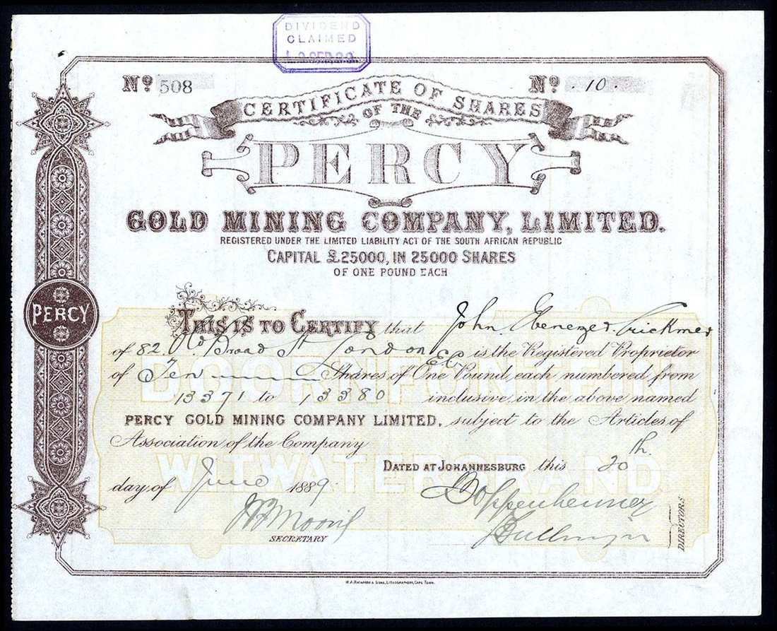 South Africa: Percy Gold Mining Co. Ltd., £1 shares, Johannesburg 188[9], no.508, signed by Bernard Oppenheimer as director, ornate border, brown, yellow underprint. Bernard was heavily involved in the diamond industry with his brother Sir Ernest. Bernard was created a baronet in 1921. AEF.