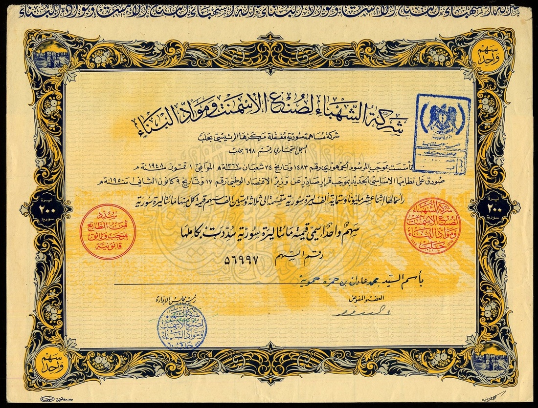 Syria: Shahba Cement and Building Materials Company, share certificate, 1948, #56997, ornate border, orange and blue, with coupons, scarce locally registered company. GVF.