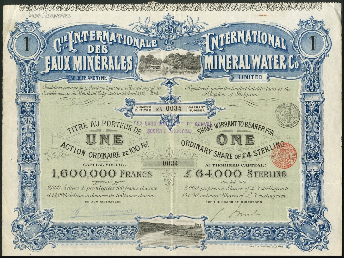 Belgium: Cie Internationale des Eaux Minerales, 100 franc share, 1902, #0034, vignette of the Chateau du Lac at top and Lake Genval at bottom, blue and black with green underprint, with coupons. This Anglo-Belgian company developed an English style park alongside Lake Genval and a castle in Rhineland style was built to exploit the mineral springs. Later converted to produce Schweppes Tonic Water but now a 5 star hotel and spa. VF.