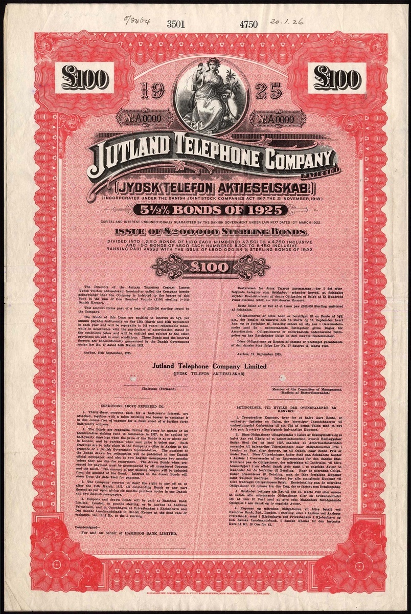 Denmark: Jutland Telephone Company Limited (Jydsk Telefon Aktieselskab), 5½% Bonds of 1925, a specimen bond for £100 from the Bradbury, Wilkinson & Co. archive, allegorical female at top within circle, red and black, with coupons, small hole cancels, printer's annotation at top, VF.