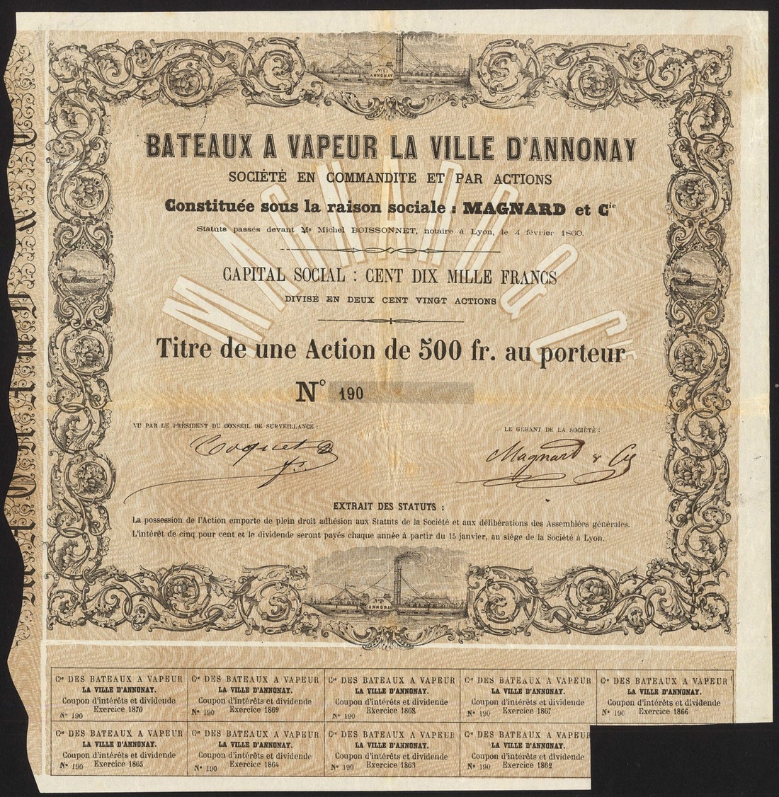 France: Bateau a Vapeur La Ville D'Annonay ... Magnard et Cie., 500 franc share, 1860, #190, OF ONLY 220 issued, vignettes of paddle steamers Annonay 1 and Annonay 2, ornate border, black and beige, with coupons. The company, founded in the 1820's as Magnard & Cie ran steamships up the Ardeche and a landing in the town of Andance. VF and scarce.