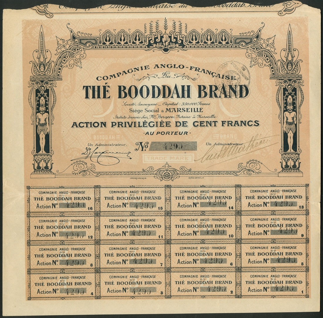 France/Great Britain: Compagnie Anglo-Francaise du The Boodah Brand, preference share of 100 francs, undated but circa 1910, #4290, Indian style borders, black with pinkish underprint, with coupons. Well known brand of tea dealers. VF.