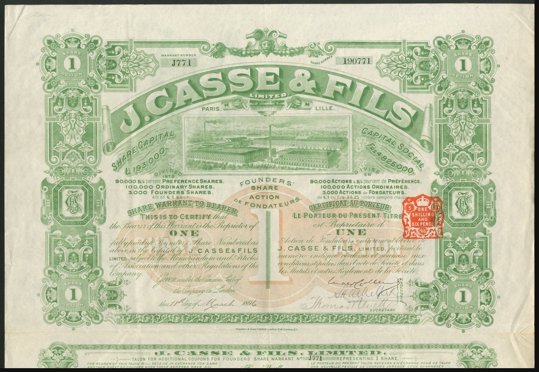 France/Great Britain: J. Casse & Fils Limited, 1 share of £1, London 189[6], #J771, signed by Count Max Hollender and Stephen Killik, attracive piece by Waterlow & Sons, green, pink underprint, with coupons. The company were linen manufacturers at Fives, Lille and Paris. Sir Stephen Killik later to become Lord Mayor of London in 1935. Count Max Hollender, well known art dealer, Chairman of the Palace Theatre. VF.