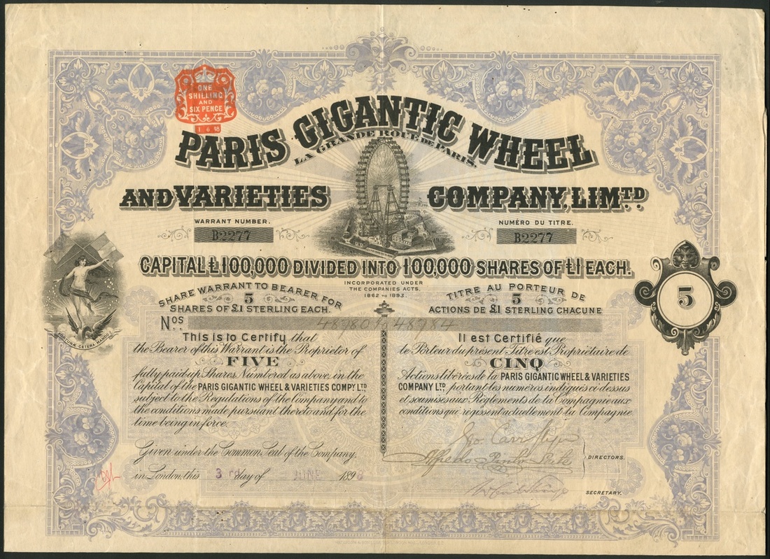 France: Paris Gigantic Wheel and Varieties Co. Ltd., a pair of bearer warrants for 5 shares of £1, London 189[8], #B2277, and 10 shares of £1, London 189[8], #C1374, both signed by Alfredo Pinto Leite and George Carr Glyn, Ferris wheel and buildings in centre, naked Fortuna on winged wheel with flags of France and England at left, mauve and orange-brown respectively, printed by Waterlow & Sons, with coupons. Built for the Paris Exposition of 1900 and was slightly larger than the London Great wheel at 300 feet diameter built in 1895 at Earl's Court. It also held 1600 passengers. The wheel was dismantled in 1920 and the carriages used for the homeless. Both slightly grubby but VF (2).