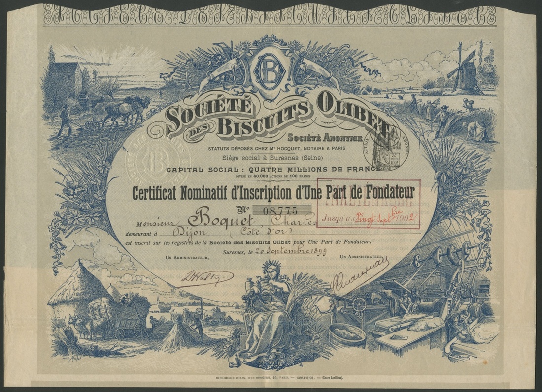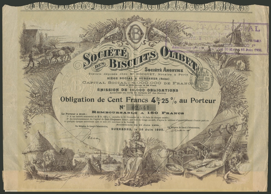 France: Société des Biscuits Olibet S.A., a pair of certificates, nominative certificate for 1 founders share, Suresnes [1899], #08775, and 100 franc bearer share, Suresnes 1898, #02541, very attractive pieces with vignettes of ploughing, cutting and gathering wheat, and factory producing biscuits, blue and brown respectively, both with coupons. A large concern started in Bordeaux in around 1860. Expanded into Paris in 1879 and Lyon in 1881. The Suresnes factory represented by these certificates was founded in 1880 and employed some 400 workers. Factory demolished in 1940. AEF and VF (2).