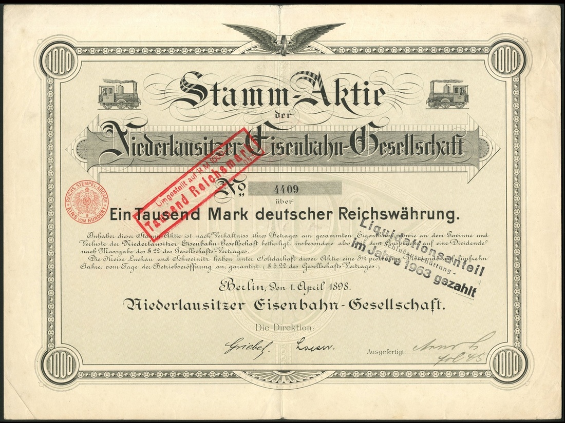 Germany: Niederlausitzer Eisenbahn-Gesellschaft, Stamm-Aktie, 1000 Marks, Berlin 1898, #4409, 2 vignettes of small locomotive, ornate border, black, red overprint revaluing the share at 1000 Reichsmark, Liquidation stamp in 1963, lacks coupons. A 113km line between Falkenberg to Beeskow, opened between 1898 and 1901. VF.