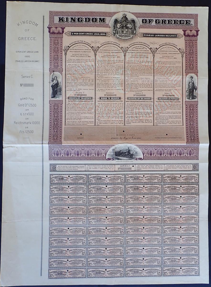 Greece: 1890 5% Loan for the Piraeus Larissa Railway, a specimen bond printed by Waterlow & Sons for 12,500 gold drachma or £500, huge format piece with Greek arms at top, steam train at bottom, allegorical figures at sides, text in 4 languages, mauve and black, with all coupons. VF-EF and rare.