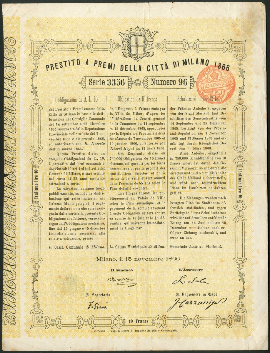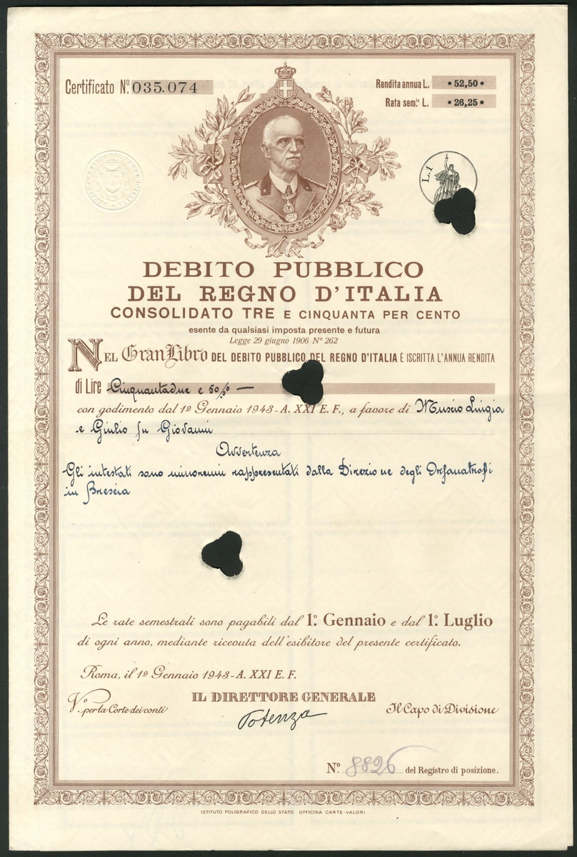 Italy: Consolidated 3.5% Public debt, 3 certificates for varying amounts dated 1943, King Victor Emmanuel III at top, brown, hole cancelled; together with bonds from San Marino (3) and the City of Milan (2). The first EF, the rest F and better (8).