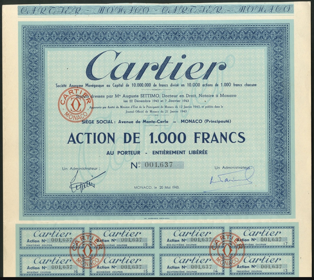 Monaco: Cartier, 1000 franc share, monaco 1943, #1637, ornate border, blue, with coupons. Cartier, the iconic jeweller, opened a branch store in Monte Carlo in 1935 and it became a separate company in 1943. EF and rare.
