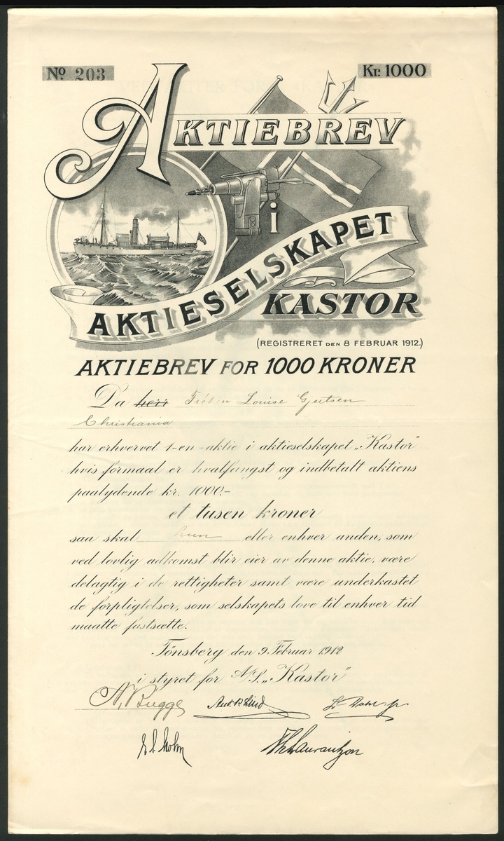 (x) Norway: Aktieselskapet Kastor, 1000 kroner share, Tonsberg 1912, #203, whaling steamship at top with harpoon gun and company flag to right, black, 4 pages. Whaling company, formed in 1912 and dissolved in 1950 when whaling was banned. GVF.