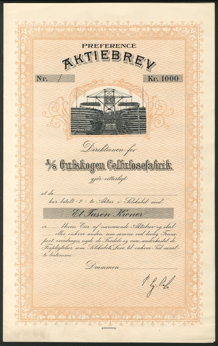 (x) Norway: Gulskogen Cellulosefabrik, an unissued preference share of 1000 kroner, circa 1918, vignette of timber store, ornate border, pink and black, with coupons. Large paper mill, important to the local economy. Merged with the mill at Mjondalen in 1971. EF.