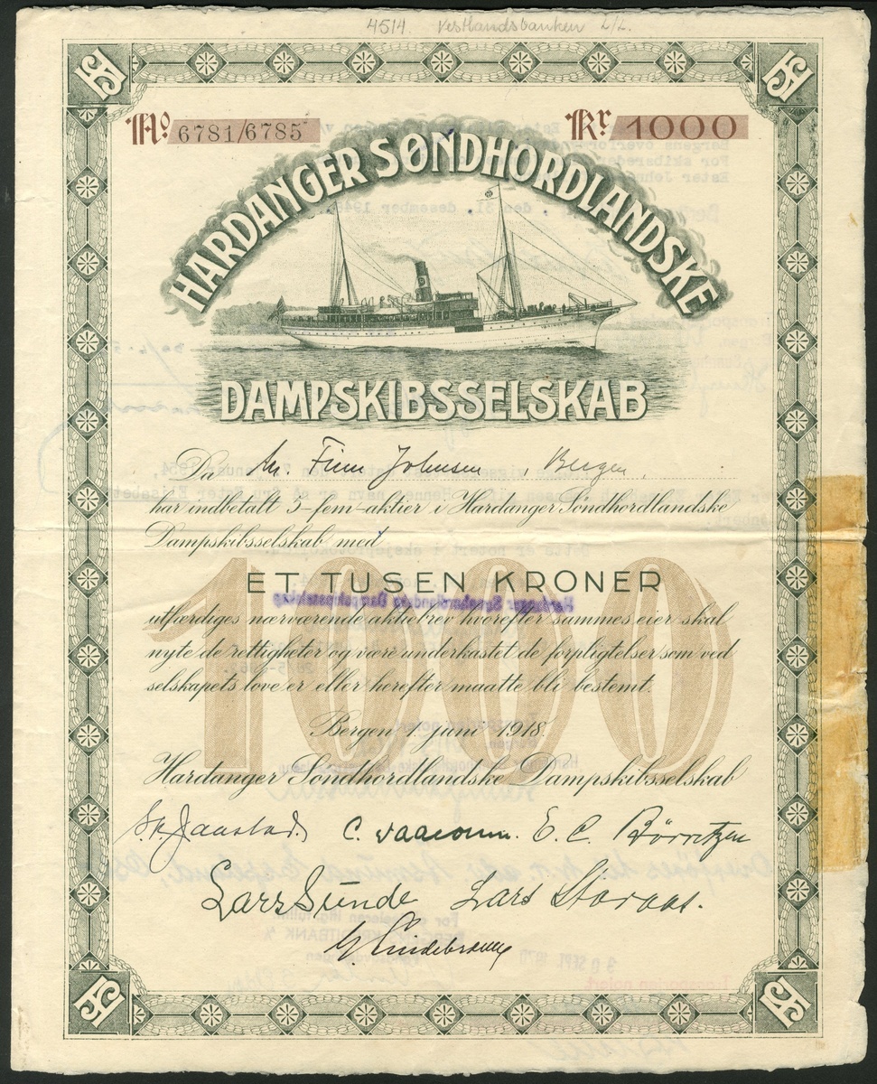 (x) Norway: Hardanger Sondhordlandske Dampskibsselskab, 5 shares = 1000 kroner, Bergen 1918, #6781-6785, steamship VORINGEN at top, green, pink underprint. Glue residue at right edge, VF.