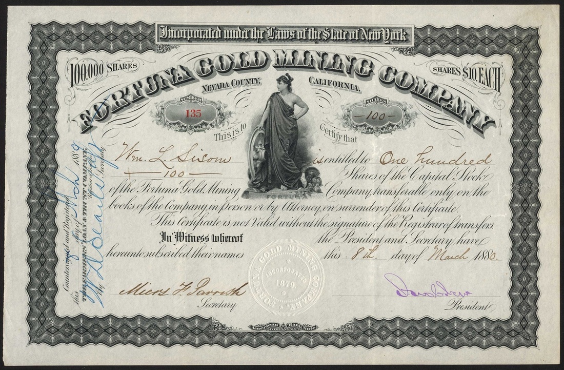 USA: Fortuna Gold Mining Company (NY), $10 shares, 188[0], #135, vignette of goddess Fortuna, black, ABNCo. printing. Mines in Nevada County, California. GVF.