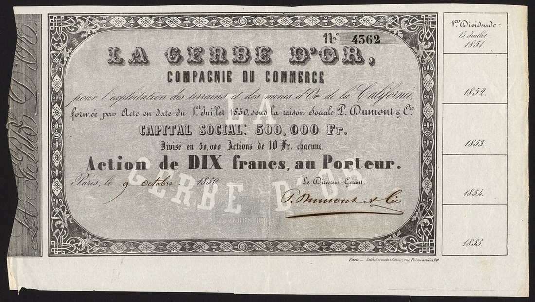 U.S.A: La Gerbe D'Or, Compagnie du Commerce pour l'Exploitation des Terrains et des Mines d'Or de la Californie, one share of 10 francs, Paris 1850, #4362, ornate border, black with grey underprint. One of the numerous French companies formed during the California Gold Rush. GVF.