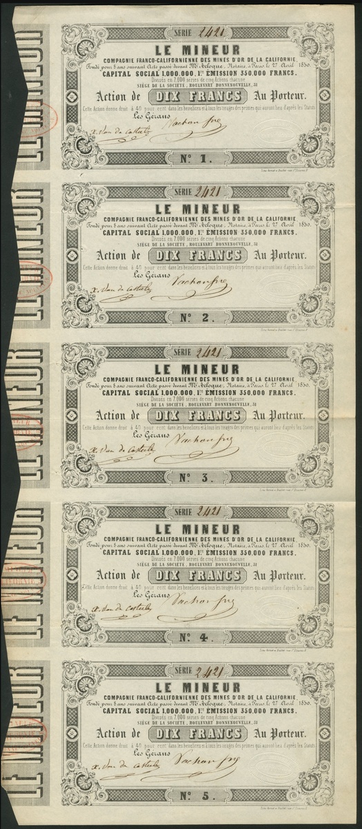 USA: Le Mineur; Compagnie Franco-Californienne des Mines d'Or de la Californie, a full sheet of 5 x 10 franc shares, 1850, #2421, each small format but with attractive borders, black. One of the numerous French companies formed to exploit the California Gold Rush. These were issued in 7000 series of 5 shares of which this is one, individually numbered 1 through 5. Rare to find as a sheet. VF.