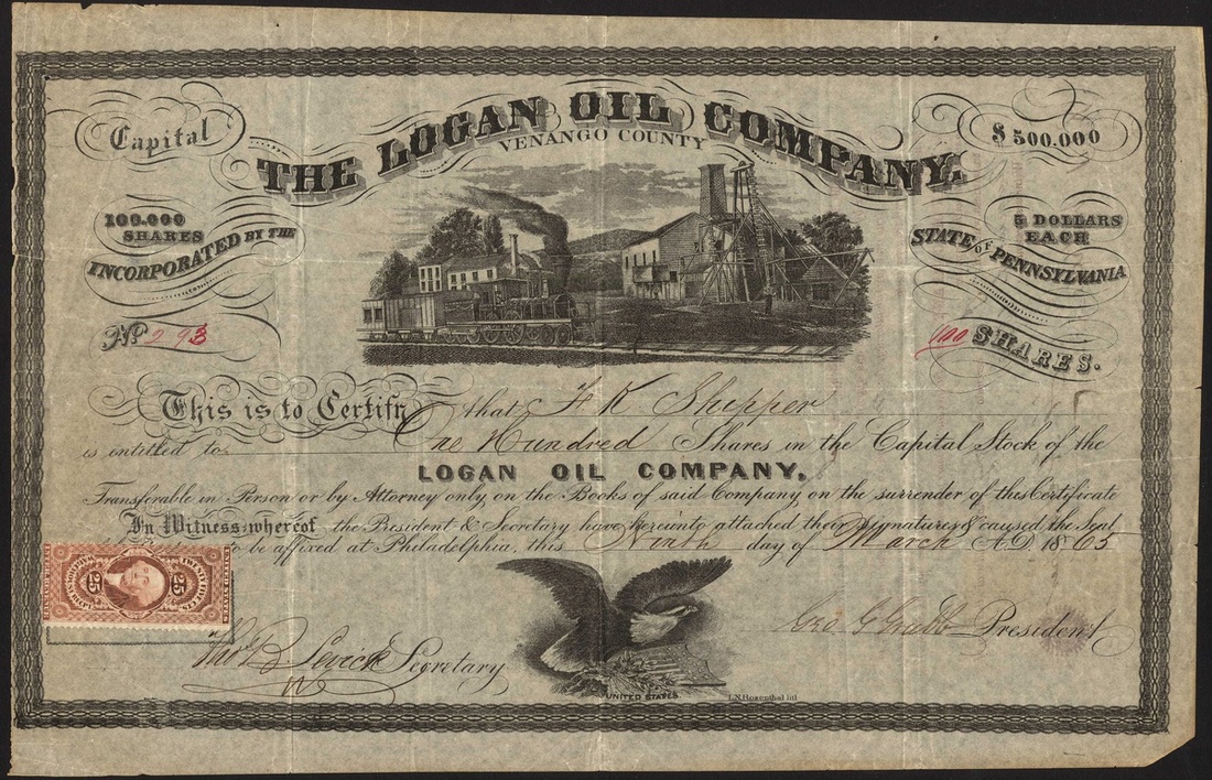 USA: Logan Oil Company, $5 shares, 18[65], #293, steam train passes oil well and buildings, black, adhesive revenue stamp, rather crude printing. Wells in Venango County, Pennsylvania. Bottom right corner chipped, AVF.
