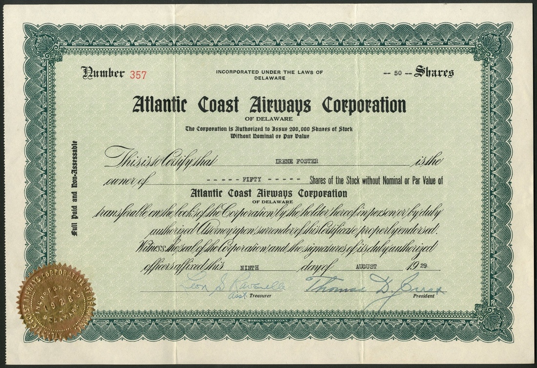 USA: Atlantic Coast Airways Corporation of Delaware, [50] shares of no par value, 19[29], #357, green and black, gold seal. GVF.