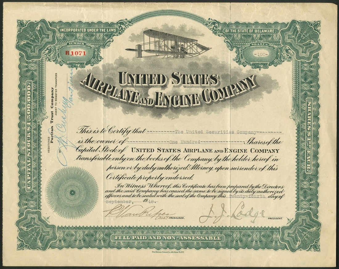 USA: United States Airplane and Engine Company, Delaware, $1 shares, 19[18], #B1071, lovely early biplane at top, green and black. VF.