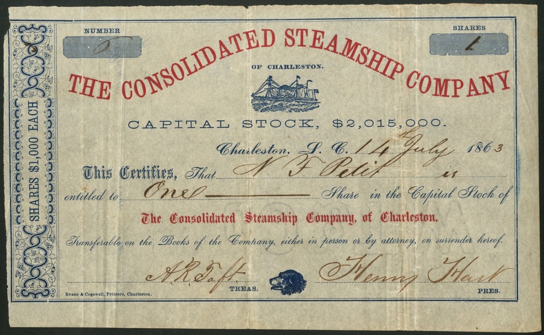 USA: Consolidated Steamship Company of Charleston, $1000 shares, 186[3], #6, small vignette of paddle steamer, red and blue, printed by Evans & Cogswell in Charleston. One of the best known of the Confederate blockade runners, signed by Henry Hart as President and A.R.Taft as Treasurer. VF and rare.