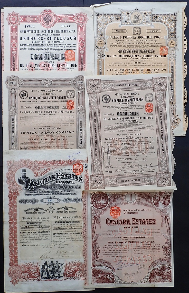 West Indies: Castara Estates Ltd., bearer warrant for 1 share of £1, London 19(10), vignettes in each corner of cocoa plantation, palm trees either side, brown, pink underprint, with coupons. Cocoa plantation on the coast of Tobago, West Indies. Together with a miscellaneous group of certificates from the U.S.A., Russia and Egypt (17) VF (18).