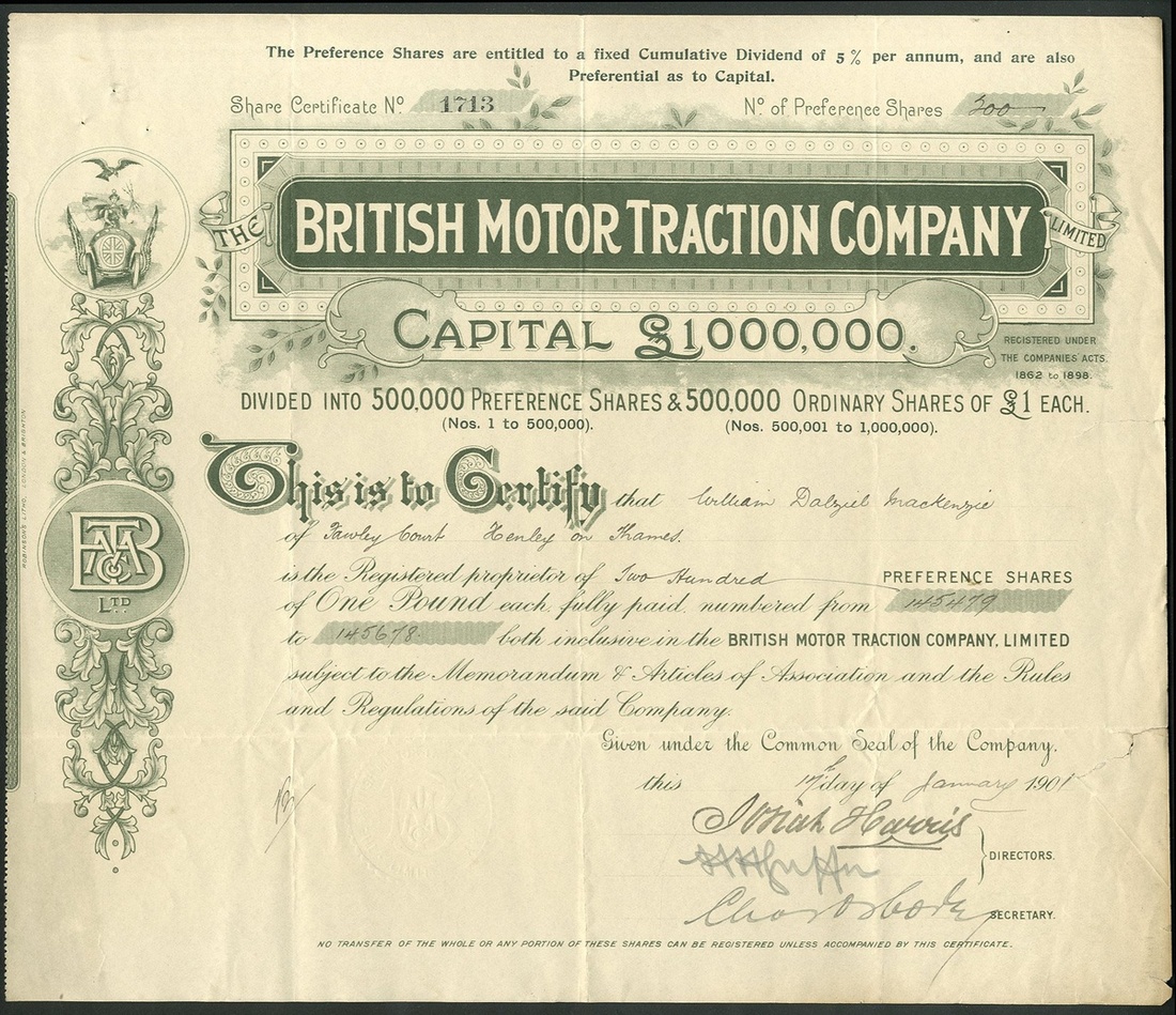 Great Britain: British Motor Traction Co. Ltd., £1 preference shares, 190[1], #1713, signed by H.H.Griffin as director, scrollwork with winged motor car at left, green. Formed in 1900 as a reconstruction of The British Motor Co. Ltd., with famous racing driver S.F. Edge, as a director. The company owned, through H.J. Lawson, many patents, including Daimler, Di Dion and Panhard et Levassor. Two repaired tears at right otherwise GVF.