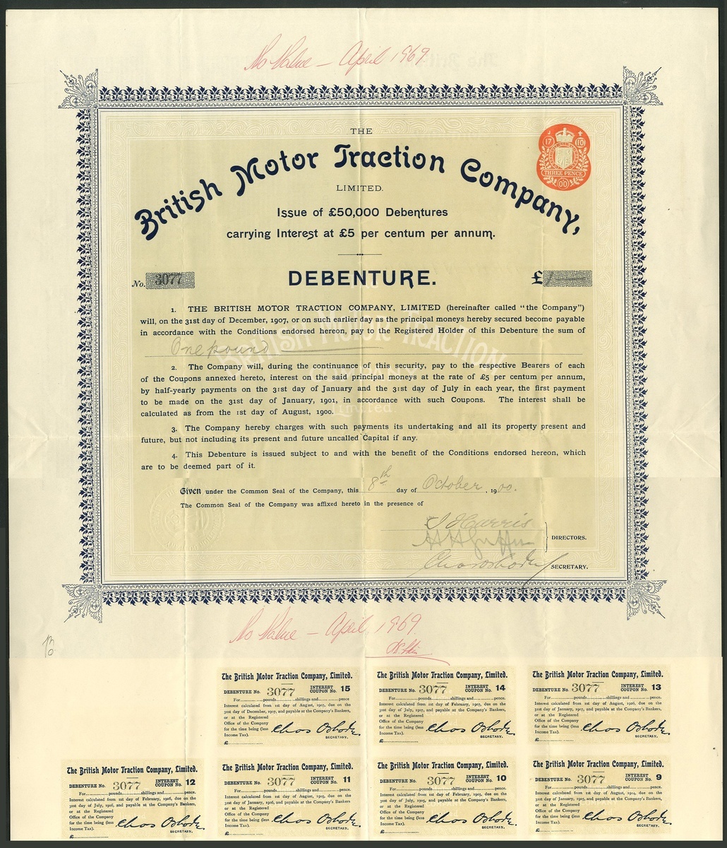 Great Britain: British Motor Traction Co. Ltd., [£1 ]debenture, 19[00], #3077, signed by H.H.Griffin as director, scrollwork with winged motor car at left, green and blue, with coupons. Formed in 1900 as a reconstruction of The British Motor Co. Ltd., with famous racing driver S.F. Edge, as a director. The company owned, through H.J. Lawson, many patents, including Daimler, Di Dion and Panhard et Levassor. red ink annotation from 1969, VF.