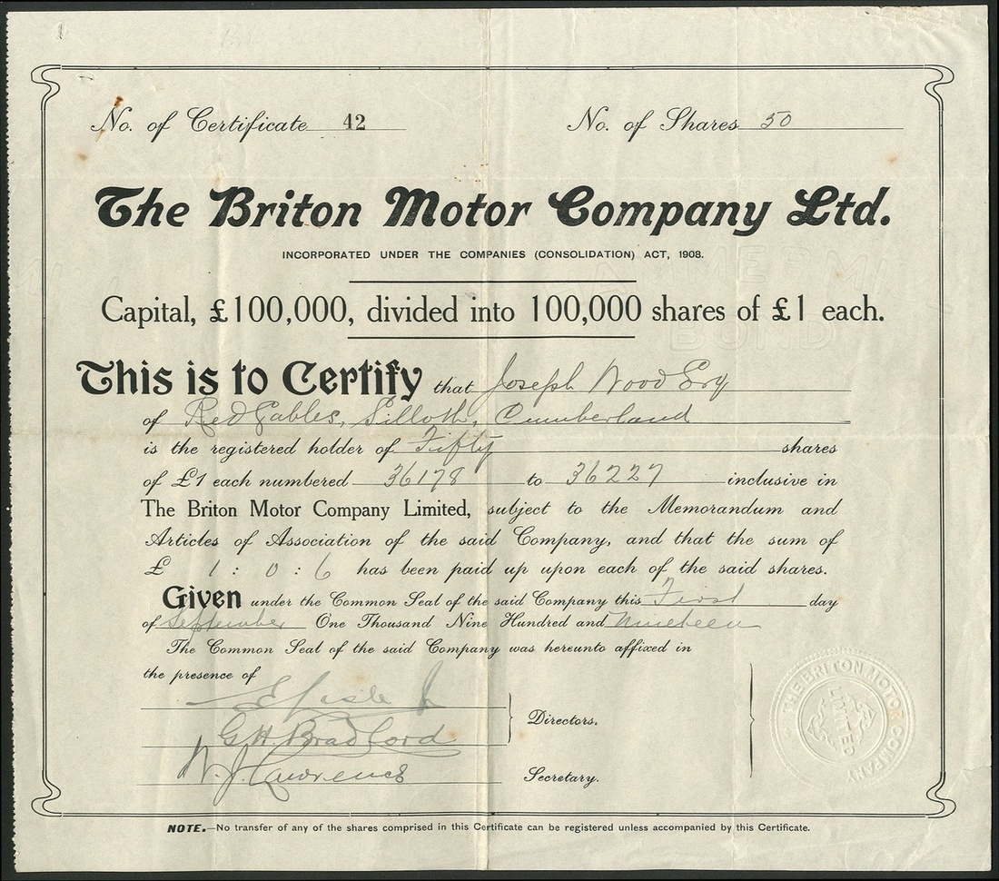 Great Britain: Briton Motor Company Ltd., £1 shares, 19[19], #42, signed by Edward Lisle Jr. as director, fine lined border, black. Formed in 1909 by the Lisle family of the Star Engineering Company of Wolverhampton, taking on the building of the Starling and Stuart models. In liquidation by 1921, the works being sold to AJS and the remains of the company being acquired by Charles Weight. AVF.